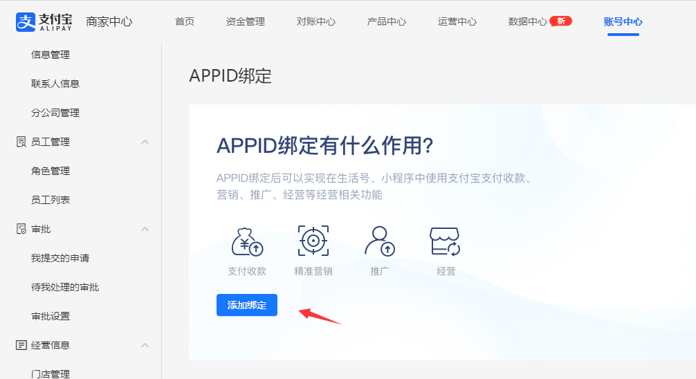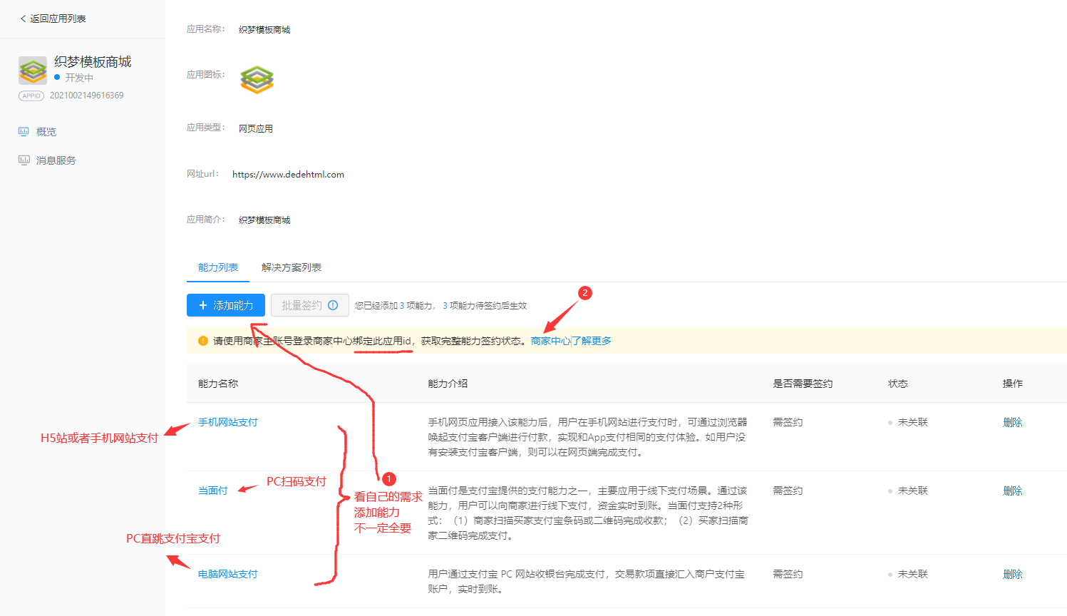 根據(jù)自己的需求添加能力 和 去商家中心綁定APPID