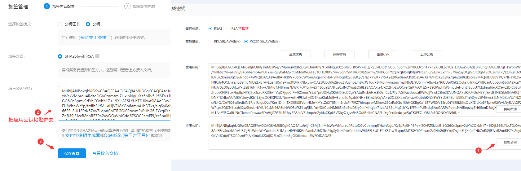把生成的應(yīng)用公鑰復(fù)制,粘貼到支付寶開放平臺加密方式設(shè)置里