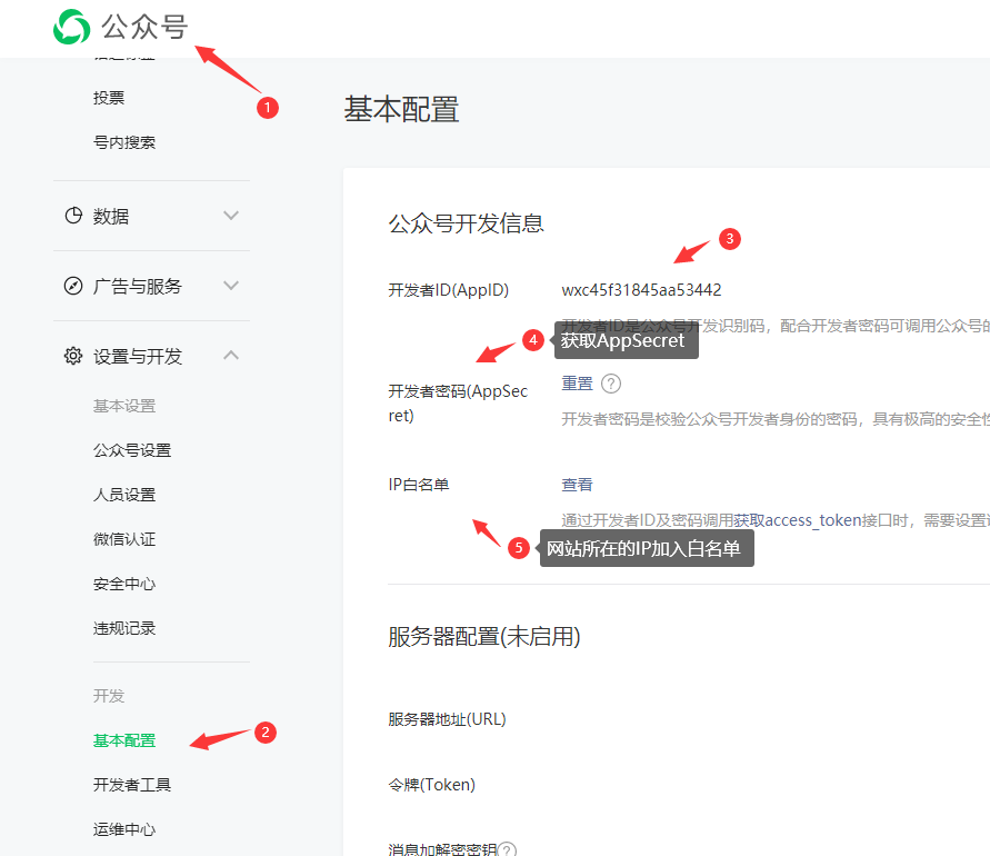 獲取 AppID AppSecret 和 設(shè)置IP白名單,并填寫到后臺微信支付配置里
