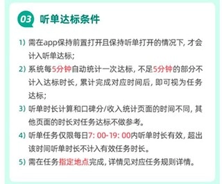 聽單任務(wù)的有效時(shí)長(zhǎng)僅限每日7:00至19:00期間的聽單時(shí)長(zhǎng),超出這個(gè)時(shí)間段的聽單時(shí)長(zhǎng)將不被計(jì)入有效任務(wù)時(shí)長(zhǎng)。