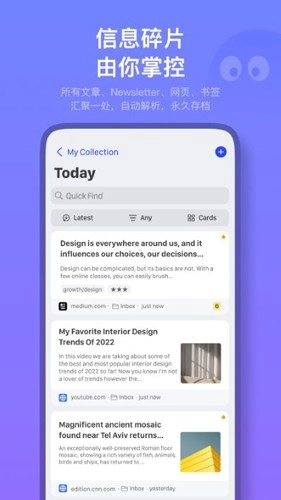 cubox手機版,Cubox手機版是一款功能出色的信息存儲與管理工具,能幫助用戶高效收集、整理和檢索互聯(lián)網(wǎng)上的重要信息。無論是文章、圖片還是視頻,它都支持一鍵收藏并智能解析內(nèi)容,方便用戶離線閱讀和個性化標注,讓知識管理變得簡單輕松,成為專屬于你的網(wǎng)絡信息助手,助力有效整合碎片化信息。