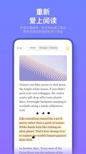 軟件可識別并解析文章正文,過濾干擾內(nèi)容,按照用戶偏好的樣式,為其提供沉浸式閱讀體驗。