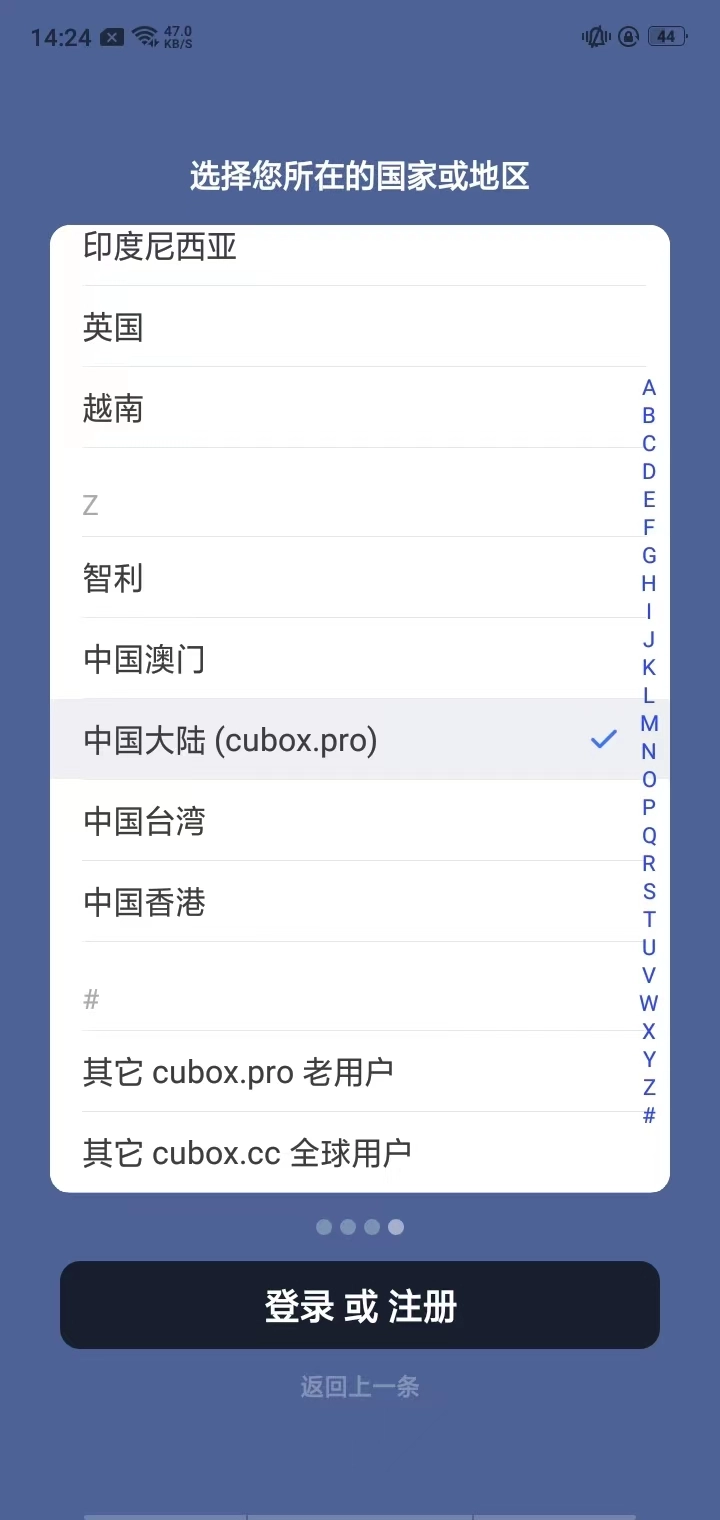 打開Cubox手機版,然后選擇你所在的地區(qū)。