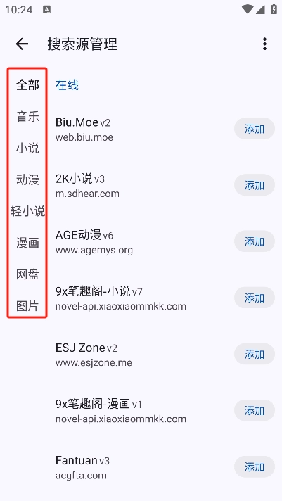 然后在搜索源管理里添加動(dòng)漫、漫畫、小說(shuō)等不同類型的搜索源。
