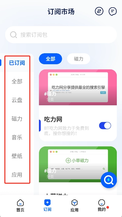 在訂閱頁面能夠查看所有搜索源,涵蓋云盤、影視、音樂等類別。