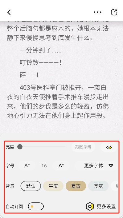 用戶在閱讀過程中,也能夠自主對(duì)背景顏色、字體大小等進(jìn)行調(diào)整。