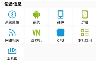 設(shè)備信息功能:能讓用戶快速查看手機(jī)相關(guān)信息,具體涵蓋本機(jī)ID、系統(tǒng)、硬件、屏幕、網(wǎng)絡(luò)相關(guān)、虛擬機(jī)、CPU、本機(jī)應(yīng)用這八類手機(jī)信息。
