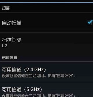 在WiFi分析儀的設(shè)置界面中,用戶能夠開(kāi)展自定義配置。在這里可以對(duì)是否自動(dòng)掃描、掃描間隔時(shí)長(zhǎng)、可用的2.4GHz與5GHz信道、全屏顯示模式、屏幕亮度以及開(kāi)放網(wǎng)絡(luò)標(biāo)識(shí)等多項(xiàng)內(nèi)容進(jìn)行設(shè)定。