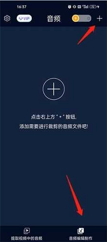 點(diǎn)擊音頻提取管家底部的“音頻編輯制作”選項(xiàng),接著點(diǎn)擊“+”圖標(biāo),添加音頻文件。