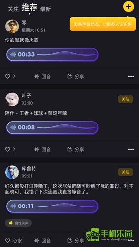 第二頁(yè)的動(dòng)態(tài)板塊是專門用于分享心情動(dòng)態(tài)的區(qū)域,大家可以在這里發(fā)布聲音動(dòng)態(tài),以便讓更多人了解你并關(guān)注你。