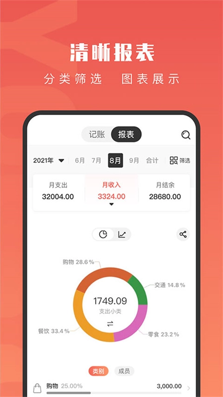 用餅圖清晰呈現(xiàn)各類支出、收入及結(jié)余情況,匯總各年份月份的收支比例,助你對(duì)財(cái)務(wù)狀況更有把握。