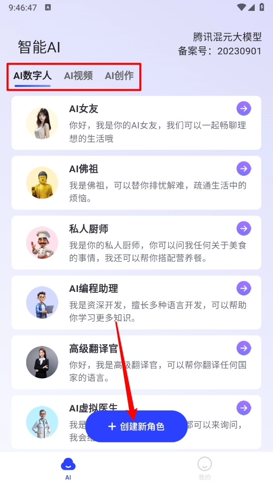 主頁(yè)包含ai數(shù)字人、ai視頻、ai創(chuàng)作等內(nèi)容,點(diǎn)擊“創(chuàng)建新角色”即可。