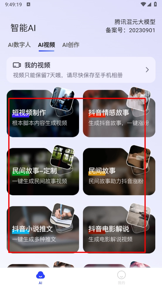 返回切換到“AI視頻”界面,這里包含多個(gè)不同板塊,你可以挑選自己需要的板塊進(jìn)入,之后輸入關(guān)鍵詞就能生成對(duì)應(yīng)的視頻了。