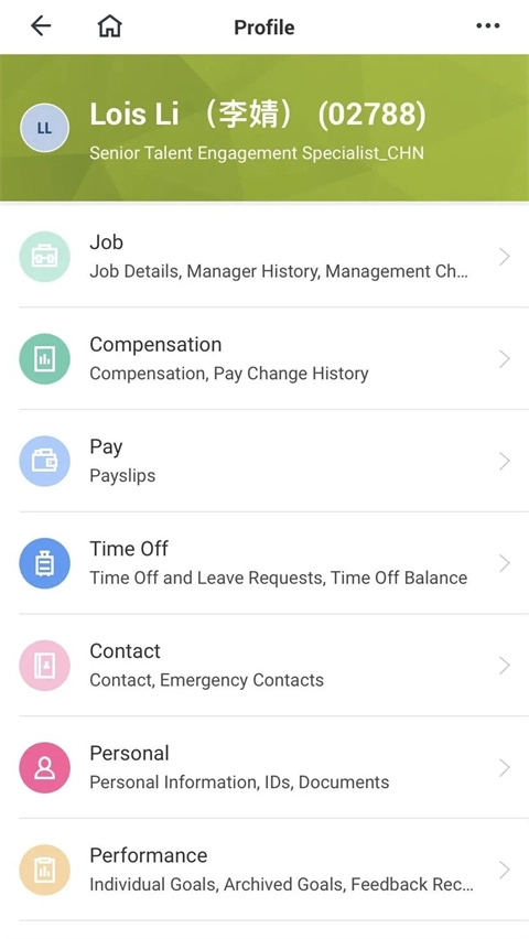 可以隨時隨地查看、更新和修改與自身相關(guān)的人事信息,涵蓋Job、Compensation、Personal Information、Contact Information等內(nèi)容