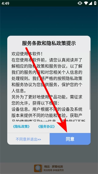 1、開啟屏幕檢測,待彈窗出現(xiàn)后點(diǎn)擊同意,即可進(jìn)入屏幕檢測功能的主界面。