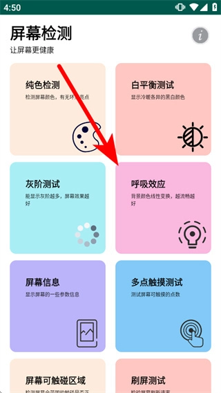 3、進(jìn)入呼吸效應(yīng)檢測界面后,根據(jù)頁面提示點(diǎn)擊底部的功能按鈕,開啟屏幕呼吸效應(yīng)的檢測流程。