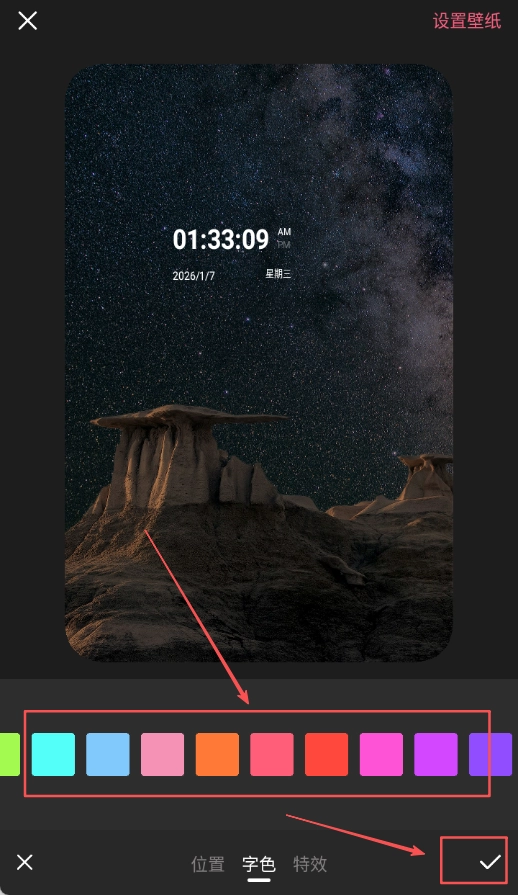 3、在字色選項(xiàng)里挑選不同顏色的字體樣式類別,選定后點(diǎn)擊對(duì)勾按鈕來應(yīng)用具體的設(shè)置參數(shù)。