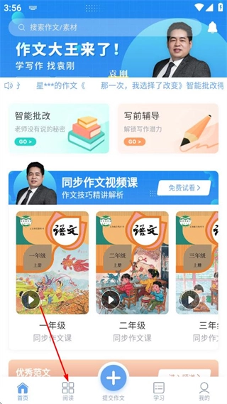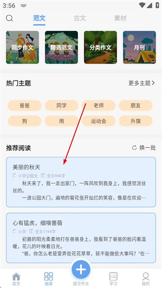 1、進入首頁后,點擊底部的閱讀選項,可進入范文頁面。