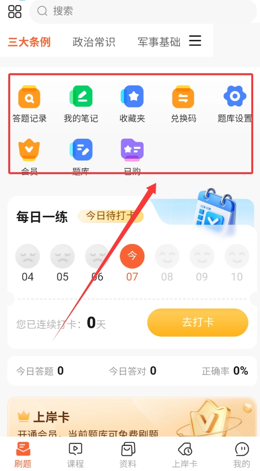 中間區(qū)域設(shè)有答題記錄、我的筆記等功能入口,底部導(dǎo)航欄則為刷題、課程等核心功能提供了快捷切換的通道。