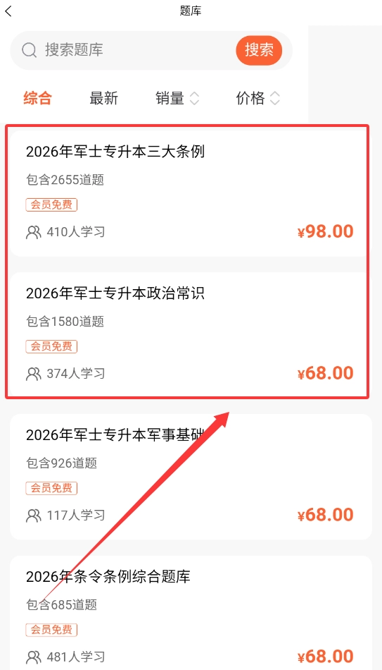 2、還能按綜合或銷(xiāo)量等條件篩選排序,各類(lèi)題庫(kù)會(huì)清晰顯示題目數(shù)量與學(xué)習(xí)人數(shù)等信息。