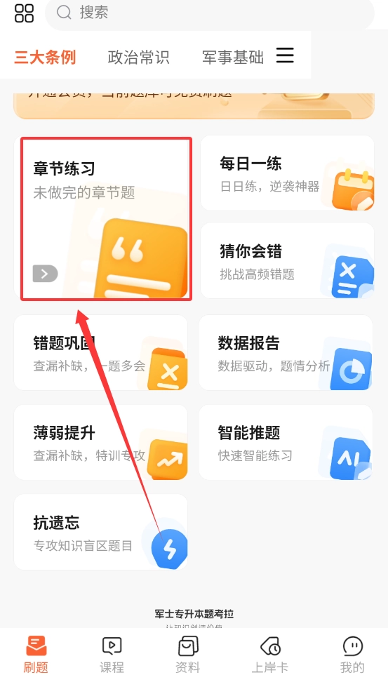 1、專(zhuān)業(yè)教研團(tuán)隊(duì)每年根據(jù)軍考大綱變化調(diào)整題庫(kù)結(jié)構(gòu),涵蓋文化基礎(chǔ)課與軍事專(zhuān)業(yè)科目共7大類(lèi)32小類(lèi)試題。