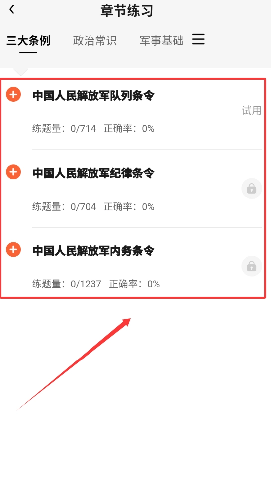 4、每個(gè)章節(jié)都明確標(biāo)注了總題量與當(dāng)前正確率,部分內(nèi)容提供試用體驗(yàn)方便提前了解題目類(lèi)型。