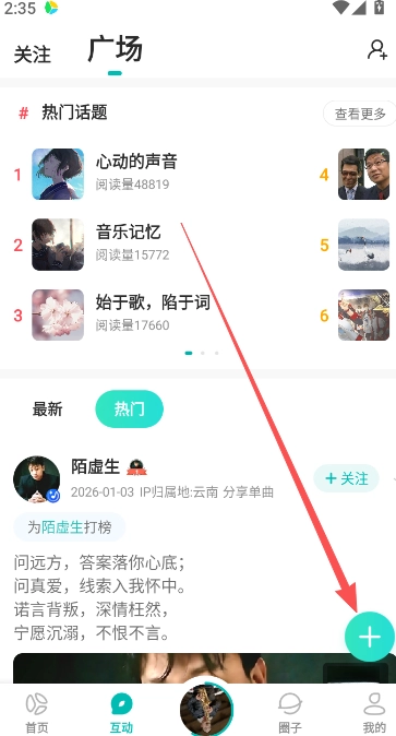 1、進(jìn)入軟件的互動(dòng)版塊后,點(diǎn)擊右下方的+號(hào)按鈕,即可進(jìn)入動(dòng)態(tài)發(fā)布主頁(yè)。