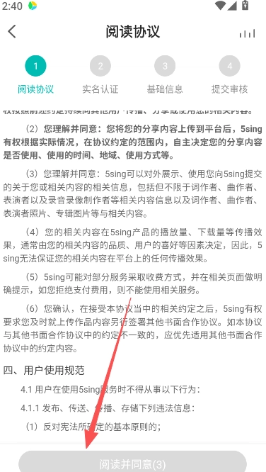 4、仔細(xì)閱讀用戶協(xié)議內(nèi)容,點(diǎn)擊實(shí)名認(rèn)證選項(xiàng),填寫相關(guān)信息并提交審核,待審核通過(guò)后,即可正式成為音樂(lè)人。