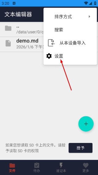 1、在【文本編輯器】界面,點擊右上角的三點圖標(biāo),打開操作菜單,就能看到包含導(dǎo)入、設(shè)置等功能的選項列表。