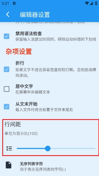 4、在【編輯器設(shè)置】頁面中,找到【行間距】調(diào)節(jié)區(qū)域,拖動滑塊可調(diào)整文本的行間距參數(shù),單位為百分比(100)。