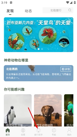 在【發(fā)現(xiàn)】頁面,你可以瀏覽到像巴布亞新幾內(nèi)亞——“天堂鳥”的天堂這類特色內(nèi)容,也能獲取【北極燕鷗】的相關(guān)信息,同時(shí)還有“你可能感興趣”板塊為你推送個(gè)性化推薦。