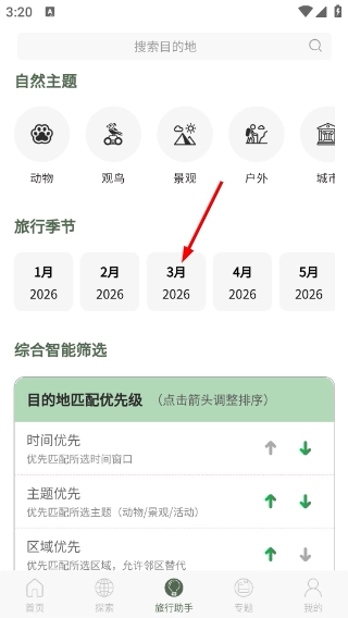 2、進(jìn)入相關(guān)頁面后,選擇【自然主題】下的分類,選定【3月-2026】旅行季節(jié),還能通過綜合智能篩選調(diào)整目的地優(yōu)先級(jí)。