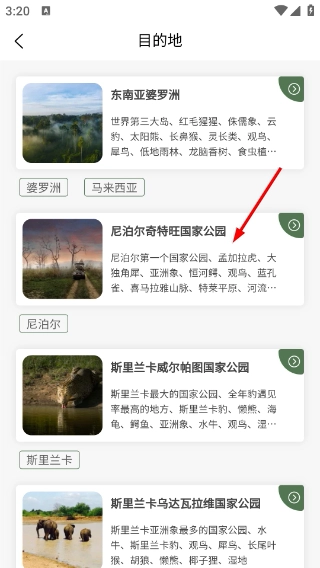 3、在【目的地】頁面,可選擇如【尼泊爾奇特旺國家公園】等選項(xiàng),查看各地點(diǎn)的相關(guān)介紹信息,選定目標(biāo)旅行地點(diǎn)。