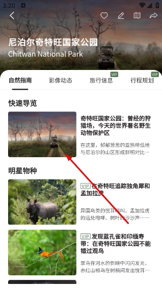 4、進(jìn)入【尼泊爾奇特旺國家公園】詳情頁,可查看【快速導(dǎo)覽】-【明星物種】等板塊內(nèi)容,了解該地點(diǎn)的自然指南信息。