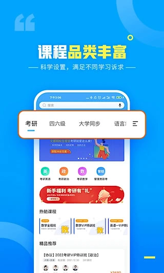 文都網(wǎng)校是一款專業(yè)的線上教育學(xué)習(xí)應(yīng)用,課程覆蓋考研、四六級(jí)、醫(yī)學(xué)執(zhí)業(yè)、公務(wù)員、建筑執(zhí)業(yè)、教師資格等多個(gè)考試領(lǐng)域。依托高清視頻授課與豐富學(xué)習(xí)資源,助力學(xué)生打破時(shí)間空間限制,高效備考、提升知識(shí)儲(chǔ)備。此外,平臺(tái)還配備學(xué)習(xí)筆記、在線答疑、階段測(cè)評(píng)及個(gè)性化學(xué)習(xí)計(jì)劃等功能工具,全方位優(yōu)化學(xué)習(xí)效率與效果。
