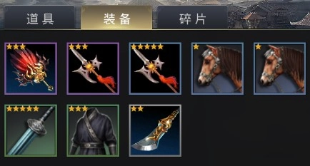 在這些裝備里,武器的類別包含刀、槍、劍、扇這四種;防具則分為甲與袍兩類;而坐騎的種類只有馬這一種。