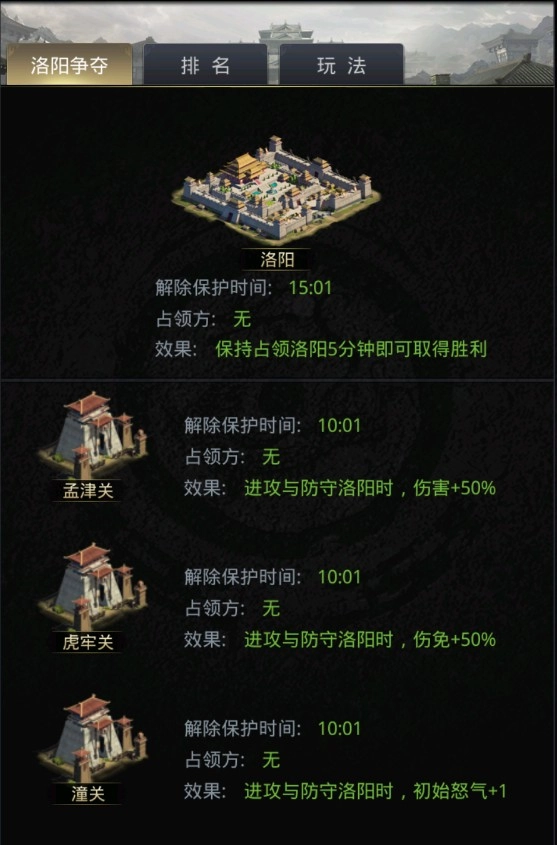 進入洛陽爭奪玩法后,戰(zhàn)局內會劃分成6大陣營,只要有陣營能持續(xù)占領洛陽5分鐘就能贏得勝利。戰(zhàn)局里的部隊行軍速度很快,通常爭奪開啟后,大約一小時就能分出勝負。
