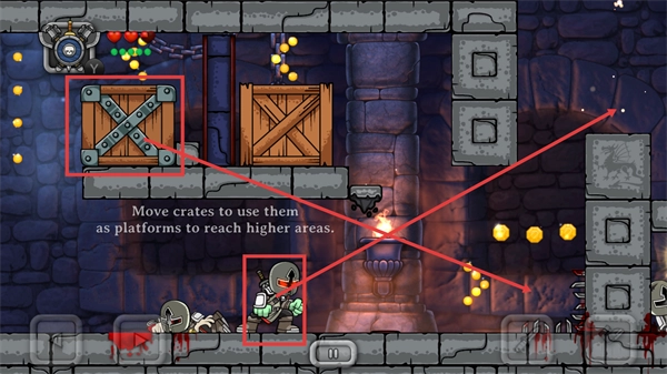 3、把木箱推過(guò)去當(dāng)作平臺(tái),就能抵達(dá)高處區(qū)域,拿到更多金幣獎(jiǎng)勵(lì),幫助推進(jìn)關(guān)卡進(jìn)度。