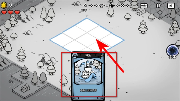 2、點擊城堡這類初始卡牌,把它放到棋盤區(qū)域,以此搭建起己方的基礎(chǔ)建筑單位。