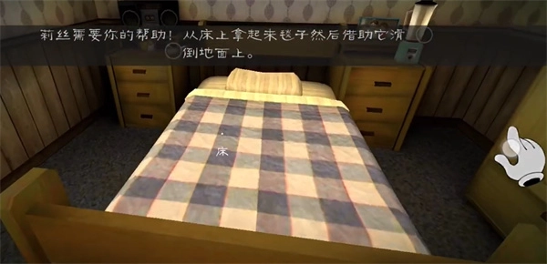 2、玩家要操控主角進(jìn)行移動(dòng),接著從床上取走毯子,再依靠它在地面上移動(dòng)。