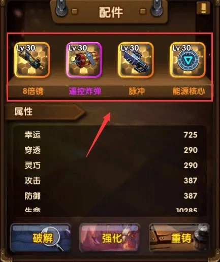配件能夠通過消耗配件碎片實(shí)現(xiàn)強(qiáng)化升級,配件強(qiáng)化等級越高,其屬性就越強(qiáng)大。在“配件”系統(tǒng)里,重復(fù)獲取配件后轉(zhuǎn)化而成的碎片,可在此處充當(dāng)強(qiáng)化材料使用。