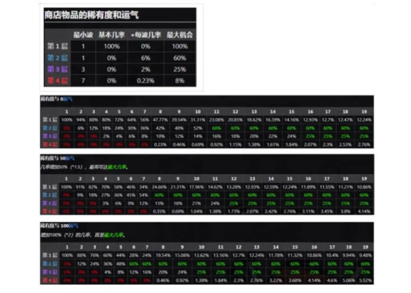 ⑥關(guān)于“幸運”這一屬性的解釋相對復雜,其核心數(shù)據(jù)采用的是乘算機制。商店中的道具會隨回合數(shù)增加以加減機制逐步提升,但存在上限。除了特殊職業(yè)【幸運兒】外,建議將幸運值堆到0、50、100這三個檔位——高幸運不僅能讓商店更易刷新出高品級道具和武器,還能提高擊殺小怪后回血道具的掉落幾率,這樣你就可以少點一些生存屬性,多堆傷害,從而更輕松通關(guān)。當然,如果你是自帶歐氣的玩家,這條建議可以忽略。數(shù)據(jù)黨可參考下圖: