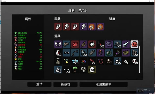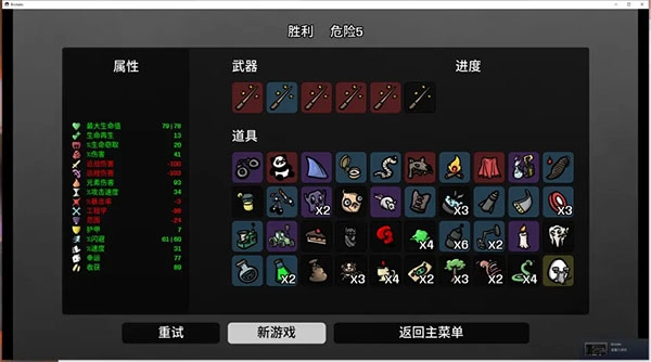 開局先用武器魔杖或者電擊槍,越早刷出噴火器就能越快進入強勢期;就算沒刷到也能玩,只是少了些爽快感和操作上的便捷,得依賴道具“蛇”的燃燒傳染效果。注意別把所有武器都換成噴火器,留2-3個左右就夠了。前期主要堆元素傷害,再加點幸運屬性,這樣能幫你更早拿到噴火器。核心道具“害怕的香腸”和“蛇”,遇到了一定要拿!要是一直刷不到噴火器,記得給現(xiàn)有武器堆點攻速,再拿“拳擊手套”和“丑牙”這兩個道具,會有不錯的效果。到了中后期,還需要繼續(xù)補充元素傷害、生命值,其中偷取屬性比再生屬性優(yōu)先級更高,另外百分比傷害、閃避、護甲、速度這些屬性也得兼顧。