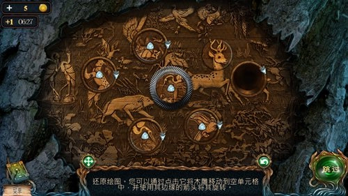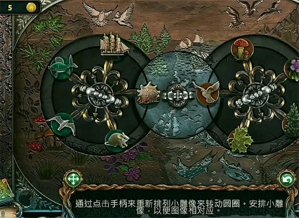 玩家需要轉(zhuǎn)動(dòng)左右兩個(gè)轉(zhuǎn)盤,左邊的轉(zhuǎn)盤逆時(shí)針旋轉(zhuǎn)三圈,右邊的轉(zhuǎn)盤順時(shí)針轉(zhuǎn)動(dòng)七圈,補(bǔ)全中間的圖案即可解開(kāi)這個(gè)謎題,從而通關(guān)“迷失森林”。