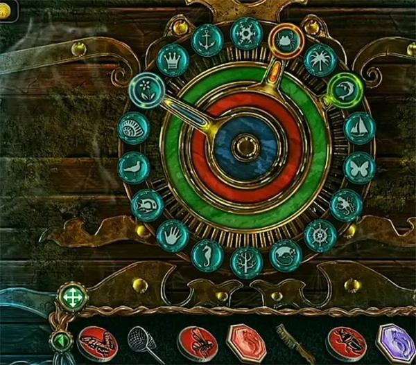 玩家需要依據(jù)圖標(biāo)的圖案,將徽章放入對(duì)應(yīng)的孔位,再轉(zhuǎn)動(dòng)輪盤,如此便能解開(kāi)謎題。