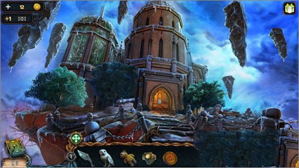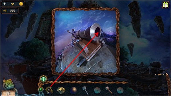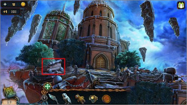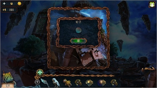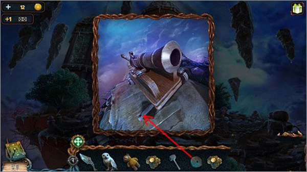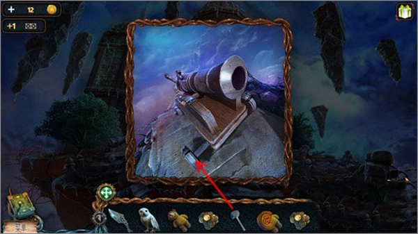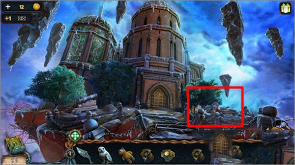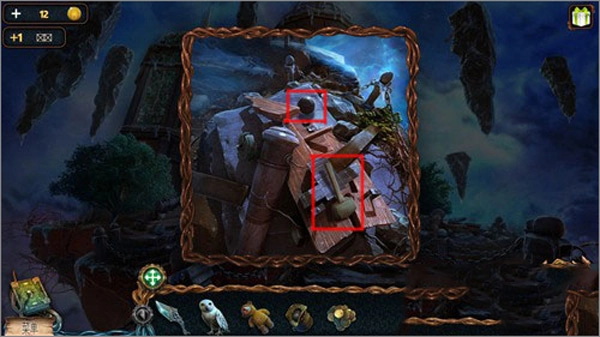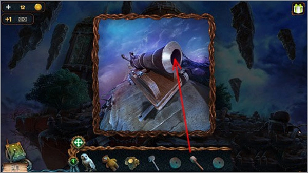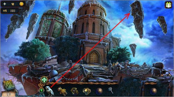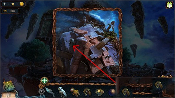 點(diǎn)擊貓頭鷹后,再點(diǎn)擊右上角懸浮著的石頭,就能讓貓頭鷹飛過(guò)去把推桿取下來(lái)。